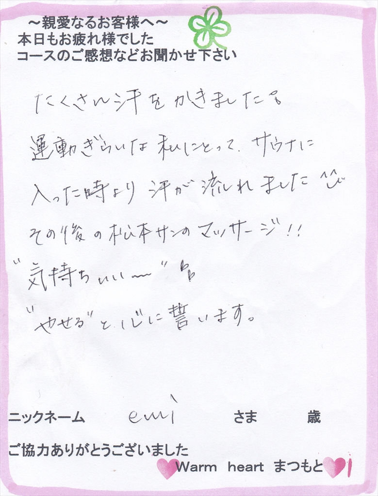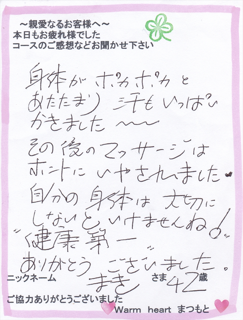 身体がポカポカとあたたまり汗もいっぱいかきました~~。その後のマッサージはホントにいやされました♪自分の身体は大切にしないといけませんね!“健康第一”ありがとうございました。 まき様 42歳