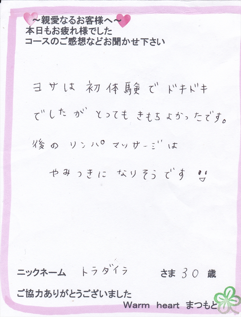 ヨサは初体験でドキドキでしたがとってもきもちよかったです。後のリンパマッサージはやみつきになりそうです(^^) トラダイラ様 30歳