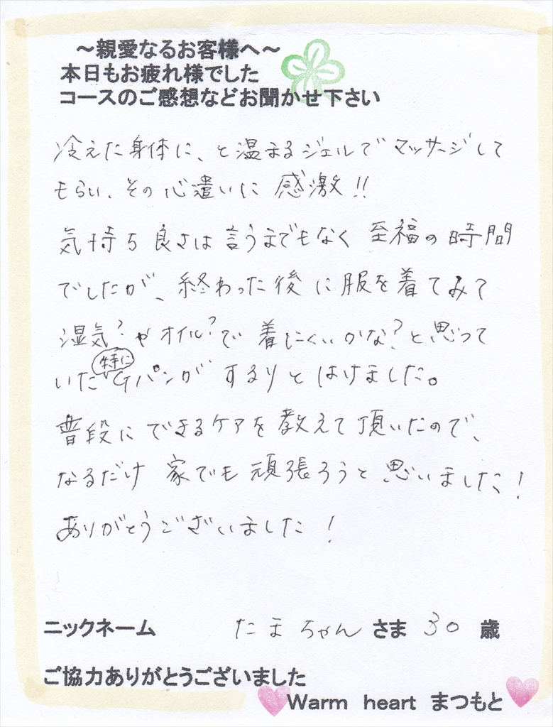 冷えた身体に、と温まるジェルでマッサージしてもらい、その心遣いに感激!!気持ち良さは言うまでもなく、至福の時間でしたが、終わった後に服を着てみて湿気?やオイル?で着にくいかな?と思っていた、特にGパンがするりとはけました。普段にできるケアを教えて頂いたので、なるだけ家でも頑張ろうと思いました!ありがとうございました! たまちゃん様 30歳