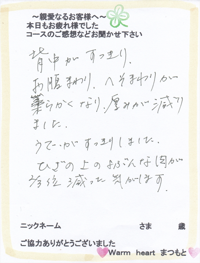 背中がすっきり、お腹まわり、へそまわりが柔らかくなり、厚みが減少しました。うでがすっきりしました。ひざの上のよぶんな肉が2/3位減った気がします。